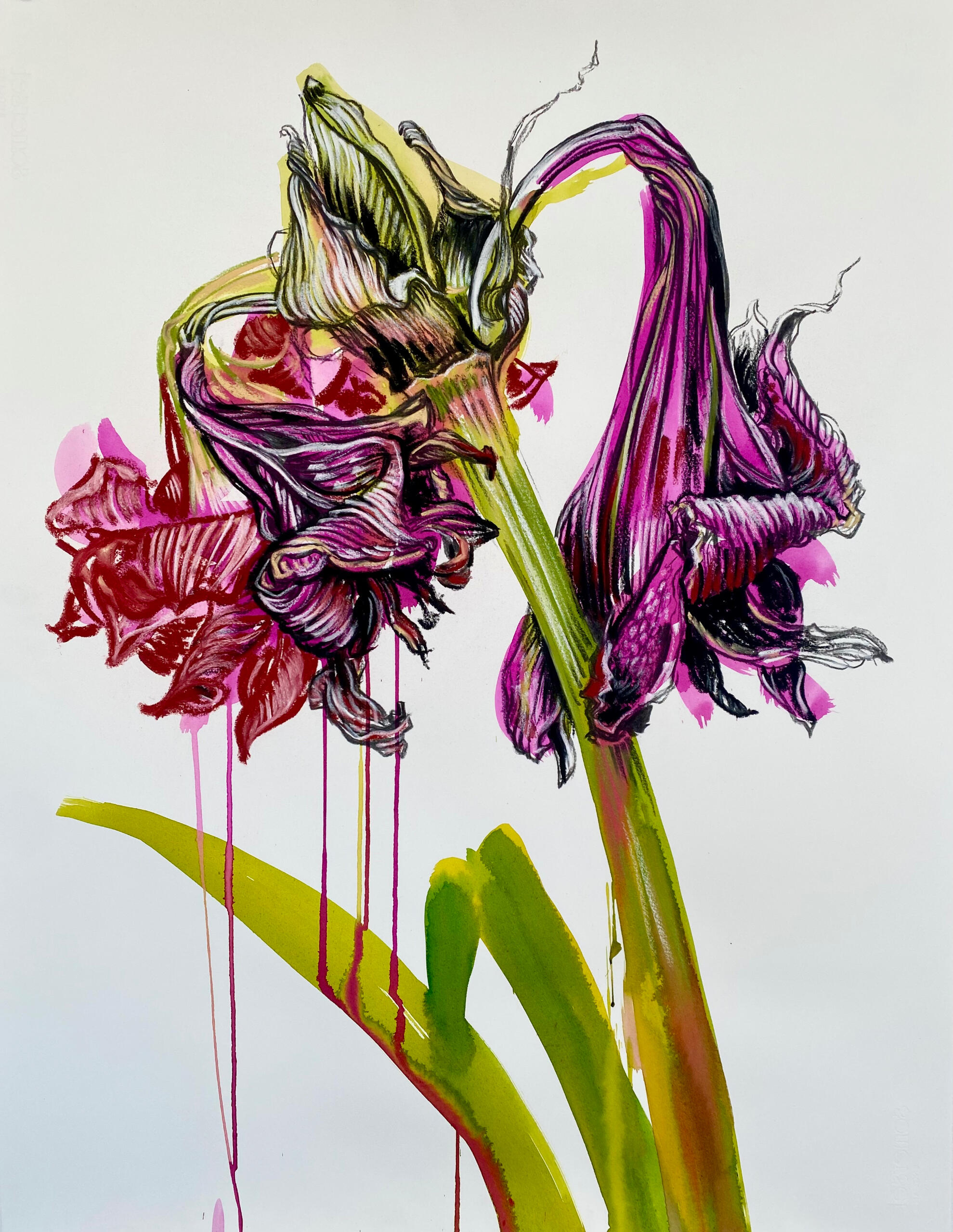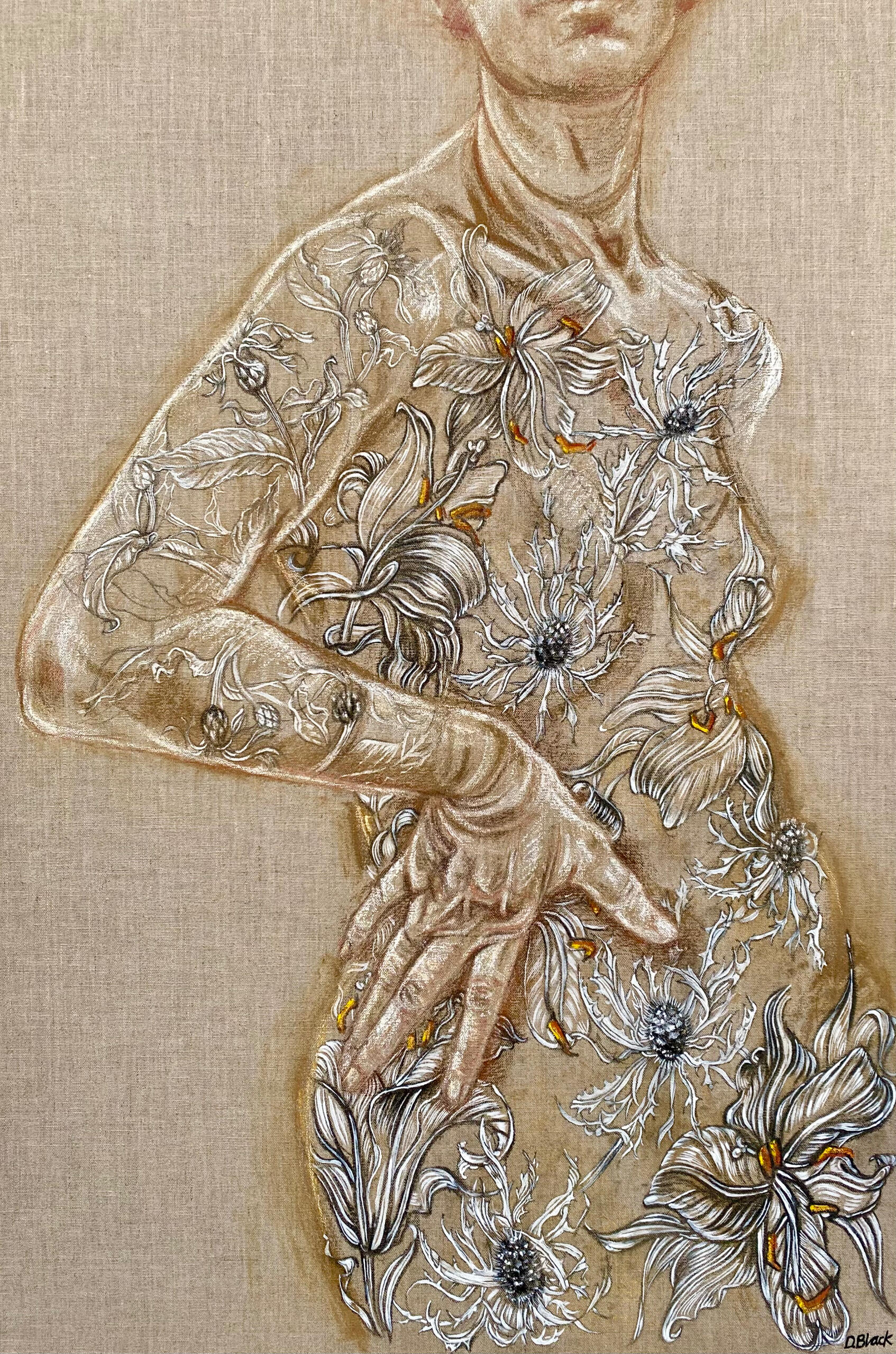 Subject matter can vary from natural forms, still life, pattern and print but predominantly figure and portrait. I love to work large scale and continuously endeavour to capture the figure in movement, creating power, drama and impact in a pose. I apply the same approach with large scale botanical studies, where I see similarities in the lines, shapes and structure of organic forms and the figure. I am fascinated in capturing these twists and turns and how they change over time from bud to withered form.I explore contrasts in my work - this may be the solid structure of a pose alongside freer painterly handling in other areas. I am fascinated with print and pattern, particularly vintage colour schemes and motifs, and use these as inspiration. I employ a range of printing techniques and often combine these with drawn and painted elements. Again, contrasts between print, detail and more free abstract treatments can be evident.